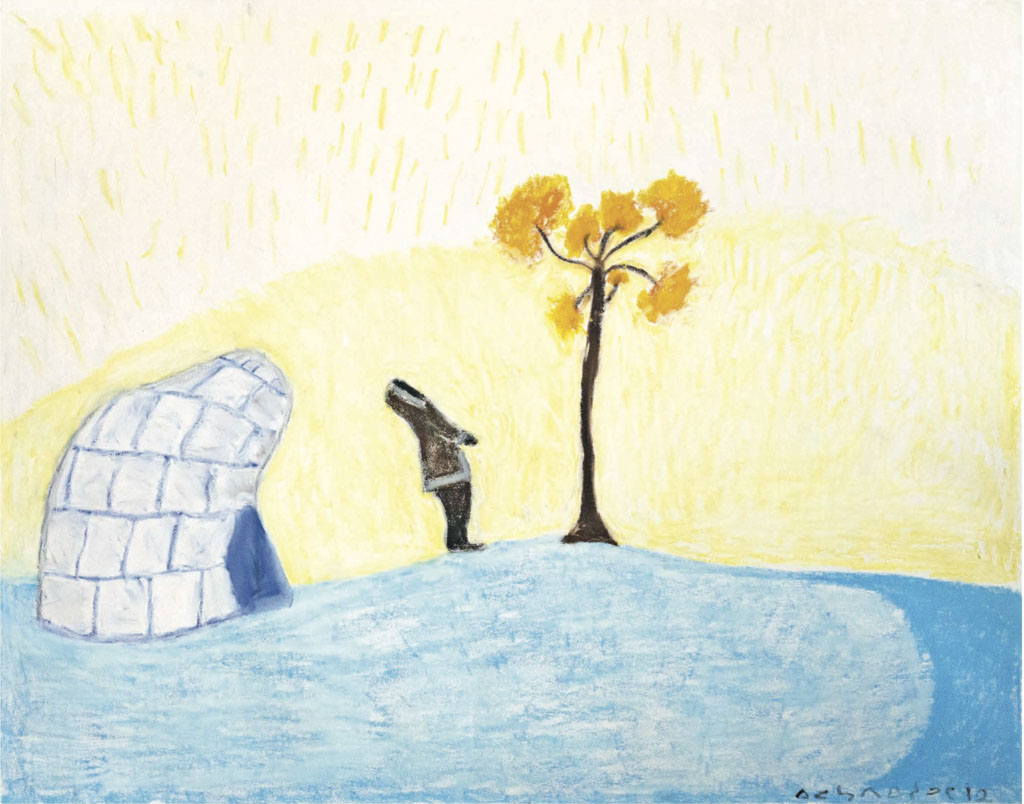 Inuit artist Elisapee Ishulutaq (1925–2018) appears in Kunuk and Mauro’s film, testifying to the state of the Arctic’s climate. She has also been testifying through her drawings, such as Climate Change (2012). The work depicts a lone Inuk in a parka, an igloo and a tree on either side. The figure faces the tree, which has begun to bloom in brilliant orange, despite being rooted in a patch of icy ground. To the back of the figure, a melting igloo lurches uncomfortably to the side; built of solid, stable blocks of snow, its melt takes on embodied, anthropomorphic dimensions as it leans longingly towards the figure. (Can an igloo long for something? Looking at Ishulutaq’s drawing, I feel distinctly that it can.)