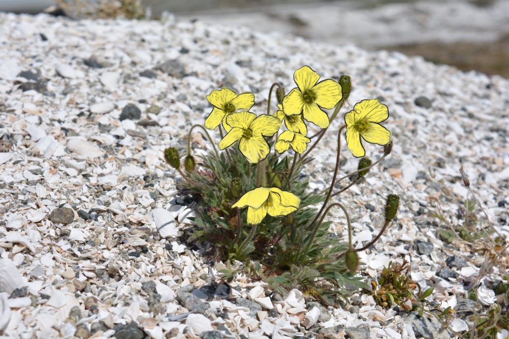 A photograph depicting yellow wildflowers growing from a rocky ground. The yellow flowers have been drawn over with black outlines and brilliant yellow markings.